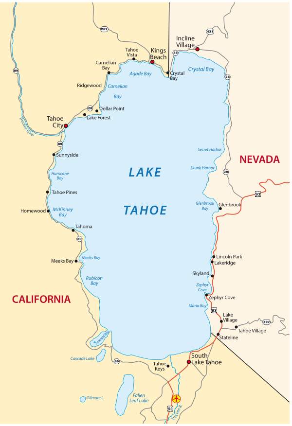 Lake Tahoe straddles the border between California and Nevada, with about two-thirds of the lake in California and one-third in Nevada. The state line divides the lake and its surrounding communities, giving visitors a unique experience depending on which side they’re on.